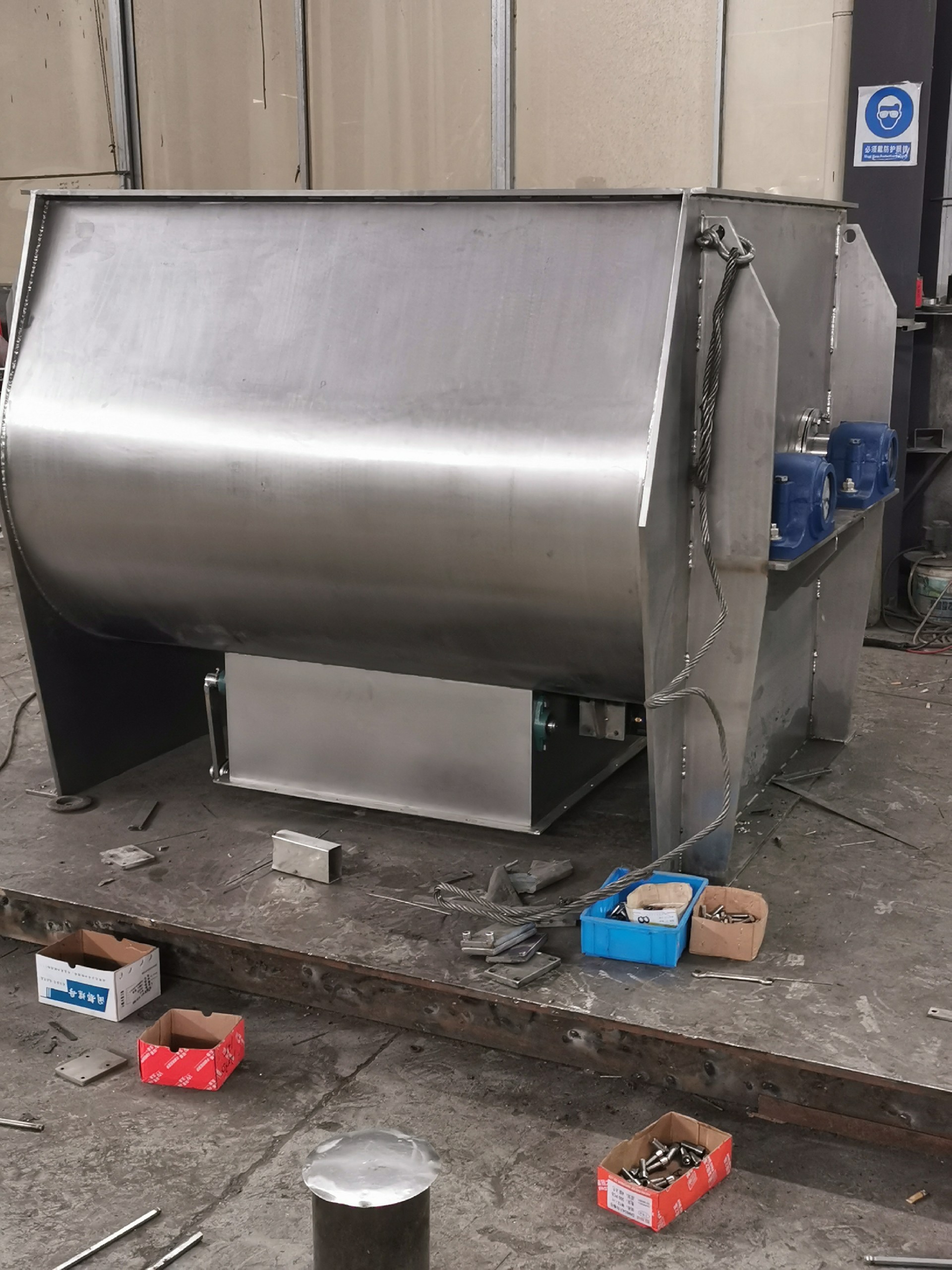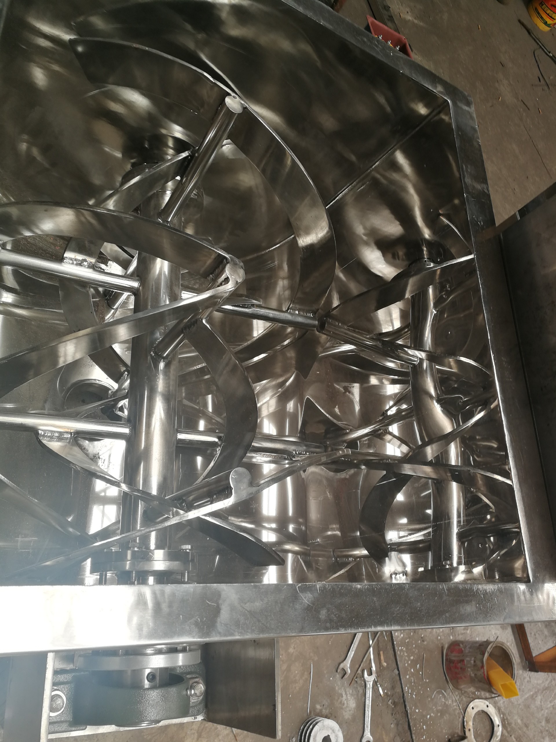 螺帶混合機主要有U形容器、螺帶攪拌葉片和傳動部件所組成的。U形的長體筒體結(jié)構(gòu),保證了被混合物料(粉體、半流體)在筒體內(nèi)的小阻力運動。螺旋葉片一般做成二層,外層螺旋將物料從兩側(cè)向中央?yún)R集,內(nèi)層螺旋將物料從中央向兩側(cè)分流,使物料在混合槽內(nèi)形成對流混合,從而達到高均勻度混合。傳送部件可以減少筒體內(nèi)的阻力運動,方便物料在流動中可以形成更多的渦流,更好的混合在一起。